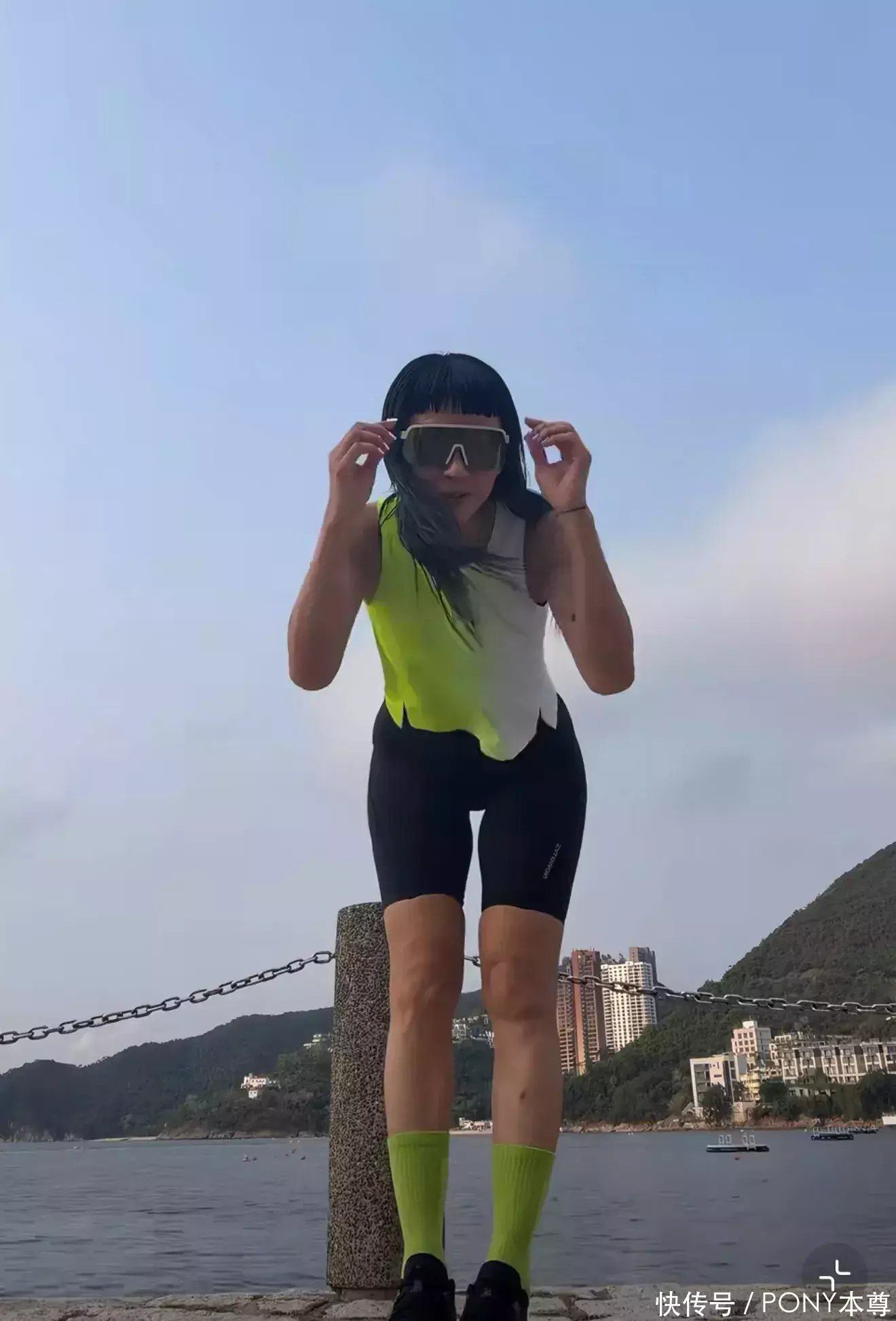 她酷爱个性服饰!白绿色相间的无袖背心搭配黑色五分瑜伽裤,搭配绿色短袜,满满的青春活力!
